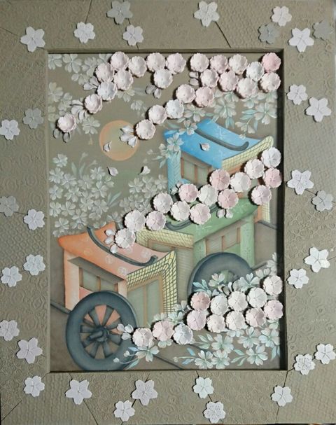 Japan Artとして日本の花、桜を描こうと思い、写真の瓶の蓋にある桜のクラフトと花の宴の御所車のペイントとのコラボ作品を出展しました。